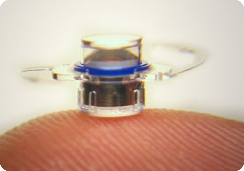 The telescope is about the size of a pea (3.6 mm ; 4.4 mm length) and is surgically placed inside the eye.