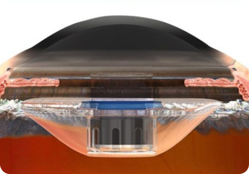 The IMT is housed in a prosthetic device (refer to professional use information) composed of three primary components: a glass capsule that contains wide-angle micro-optical elements; a clear polymethylmethacrylate (PMMA) carrier; and a blue PMMA light restrictor. The sealed optical component is snap-fitted into the carrier plate.