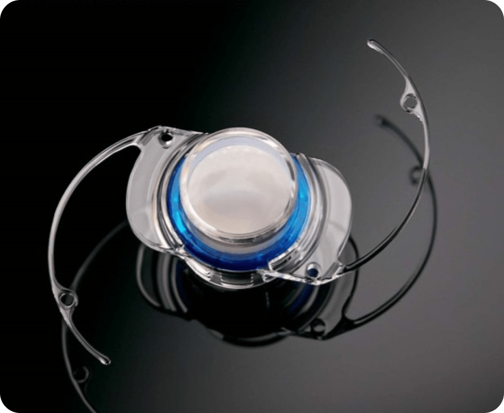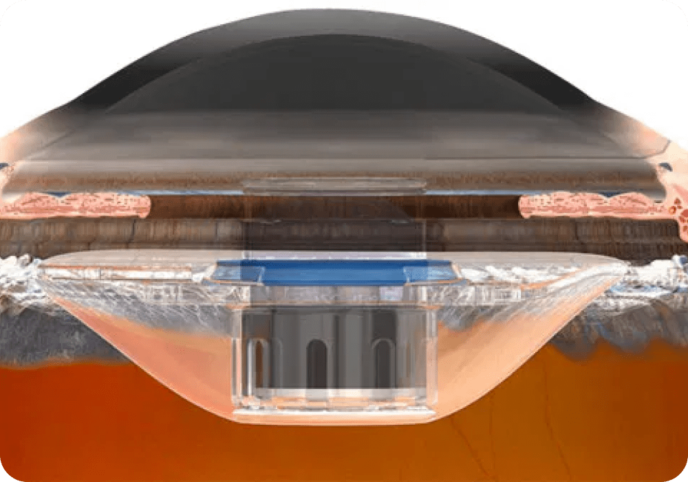 The IMT is housed in a prosthetic device composed of three primary components: a glass capsule that contains wide-angle micro-optical elements; a clear polymethylmethacrylate (PMMA) carrier; and a blue PMMA light restrictor. The sealed optical component is snap-fitted into the carrier plate.